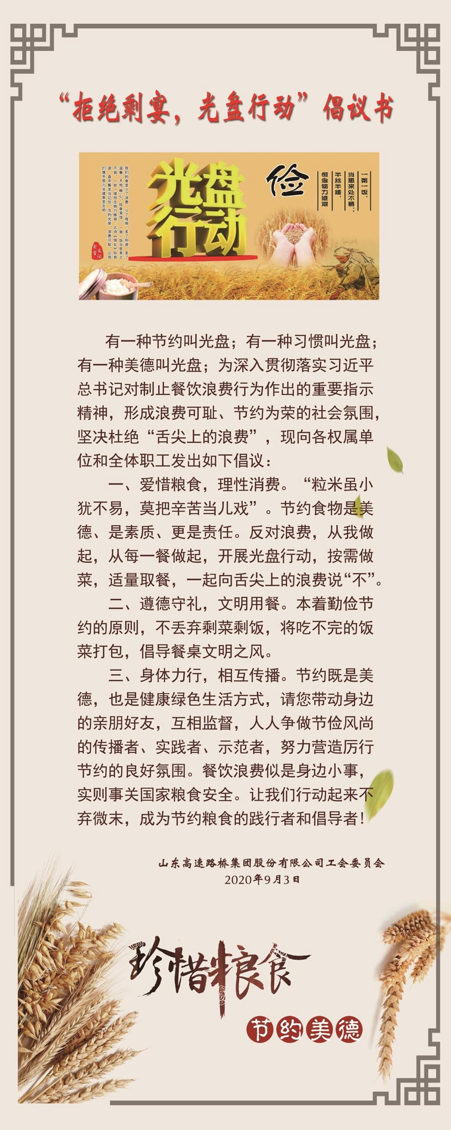 为贯彻落实习近平总书记制止餐饮浪费的指示精神,路桥股份全体职工誓将“厉行勤俭节约,反对铺张浪费”的倡议深入开展。