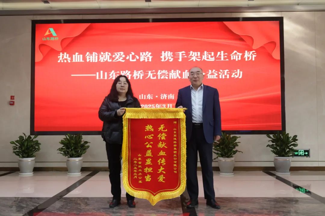 活动中,省献血办公室主任王淑荣向公司党委委员、工会主席张子鑫送上锦旗,对公司大力支持山东省无偿献血事业表示感谢。此次活动充分践行了山东路桥人的初心使命,广大职工用实际行动支持和参与爱心献血事业,以热血传递温暖,用奉献诠释担当,充分彰显了国有企业社会责任。